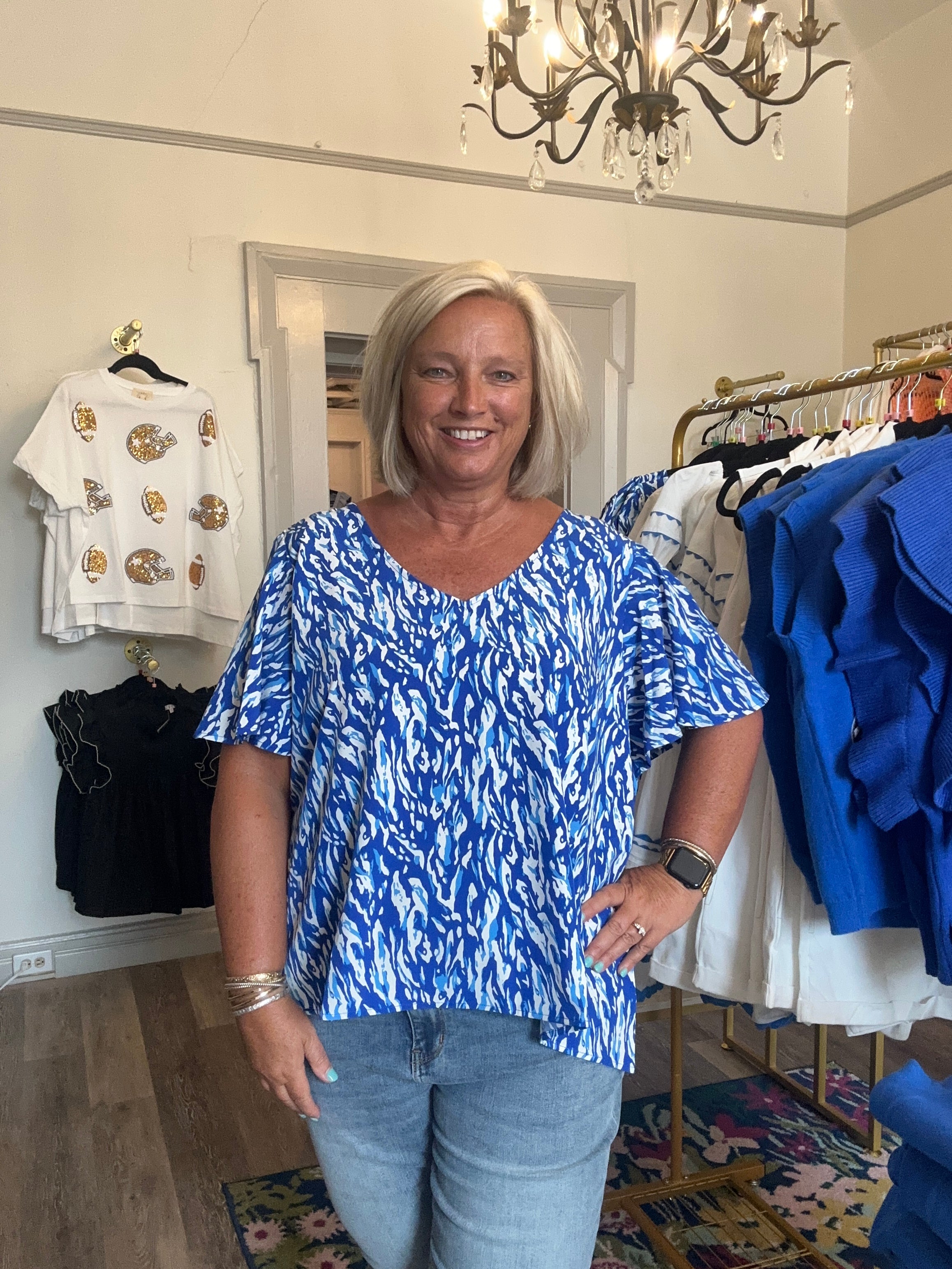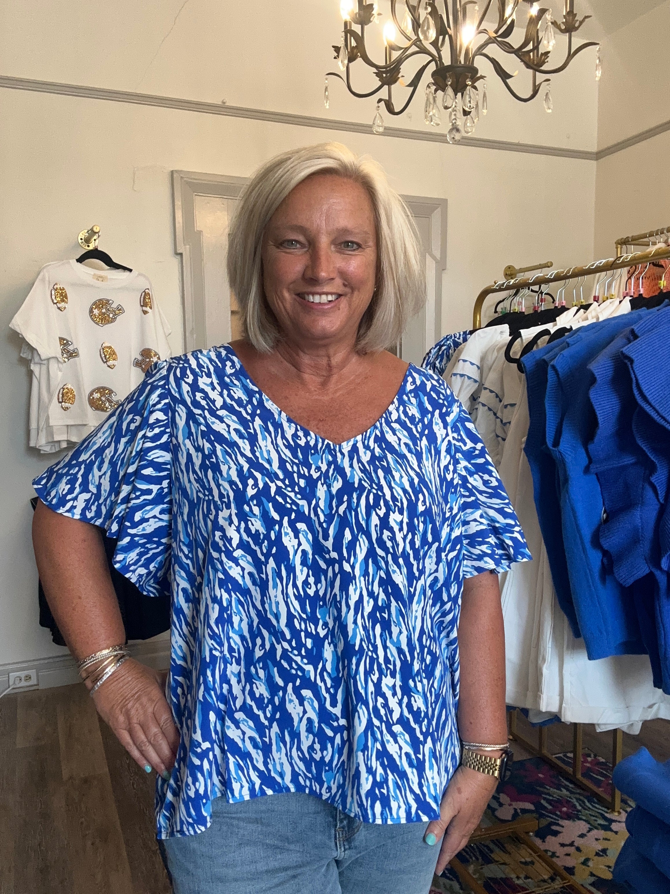 Michele McDowell blue and white print top